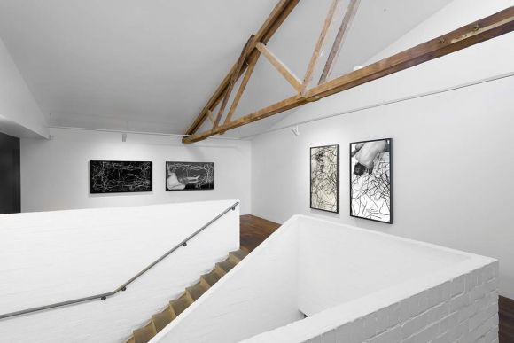 The vertical videos show a creamy back with its hundreds of interlocking muscles - shot from above - in the act of rubbing, smudging and smearing charcoal, on large sheets of watercolour paper. Writhing naked, the body draws itself, following the outlines of hands and feet, as amoebic limbs push figure and ground as close as they could possibly be: to the point of the visceral, the corporeal, the primal. The traces of charcoal left on the body is left also on horizontal drawings that sit in between those vertical videos.